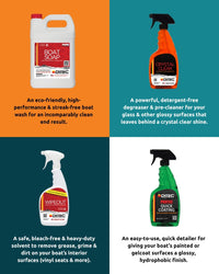 • Boat Soap's advanced (and concentrated) formula is safe for glass, tile, gelcoat, ceramic coating, waxes and other surface treatments. It lifts trapped dirt molecules, leaving behind an incomparably clean and streak-free surface